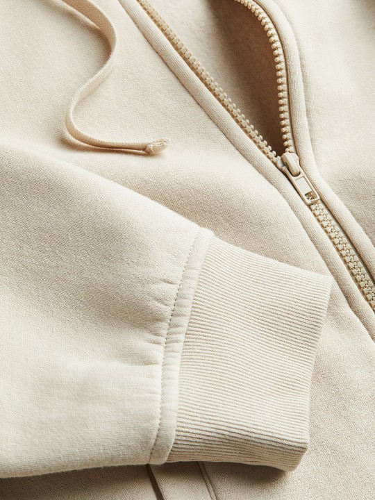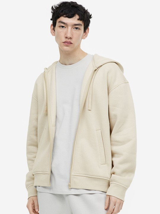Zip-through hoodie in lightweight sweatshirt fabric made from a cotton blend with a soft brushed inside. Jersey-lined, drawstring hood, a zip down the front, diagonal, welt side pockets and wide ribbing at the cuffs and hem. Loose fit for a generous but not oversized silhouette.